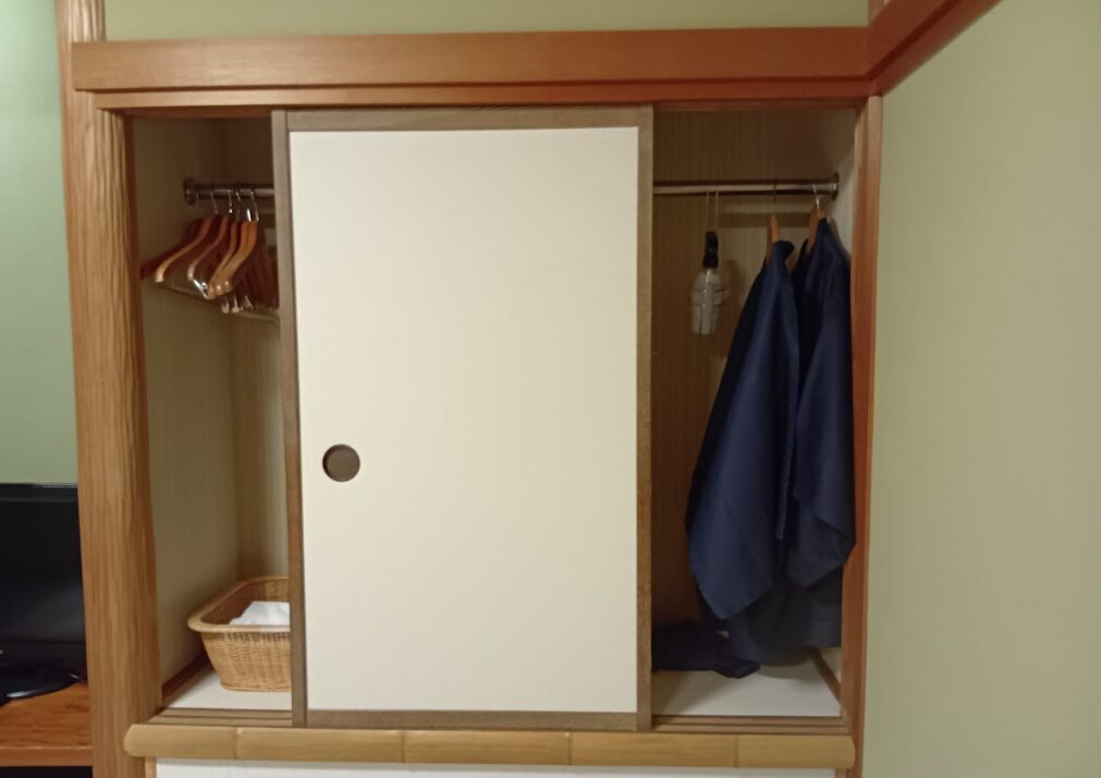 受付が終わると、隣にあった棚で浴衣を選びました。部屋着はありません。