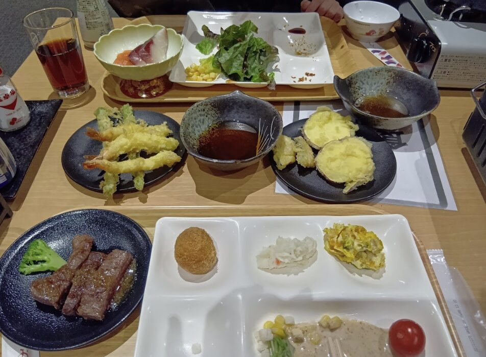 ライブキッチンがあり、お肉は焼きたて、天ぷらは揚げたてが食べれました。